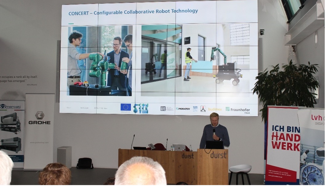 Bressanone (Italy) - The association for metalworkers organized their annual meeting at the Durst company in Bressanone, Italy. Fraunhofer Italia was invited to talk about modular and collaborative construction robotics, especially focusing on Fraunhofer Italia’s activities in the CONCERT project. The validation of construction relevant use-cases has been presented by Michael Terzer and discussed with the participants